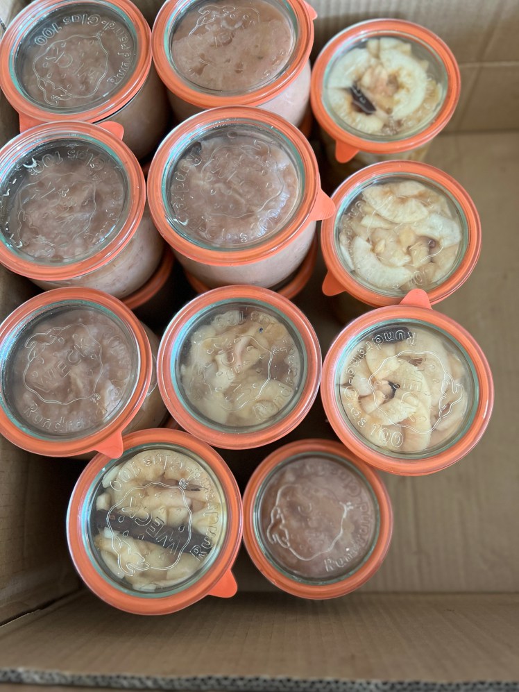 I decided to make the most of this apple bounty by turning some into apple pie filling and using a steam juicer for the rest. The result? A lovely, low-acid apple juice and a delicious apple puree. It was a busy day but so worth it!