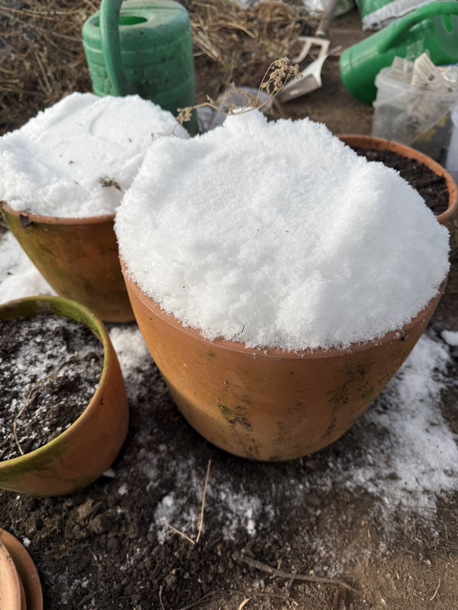 Our pots with spring bulbs have been inside the greenhouse since autumn. As the greenhouse warms during sunny afternoons, the soil dries out. Since the water isn’t pumped yet due to -10°C temperatures, we decided to bring snow inside. It will melt slowly, providing gentle moisture to the pots without shocking the plants.