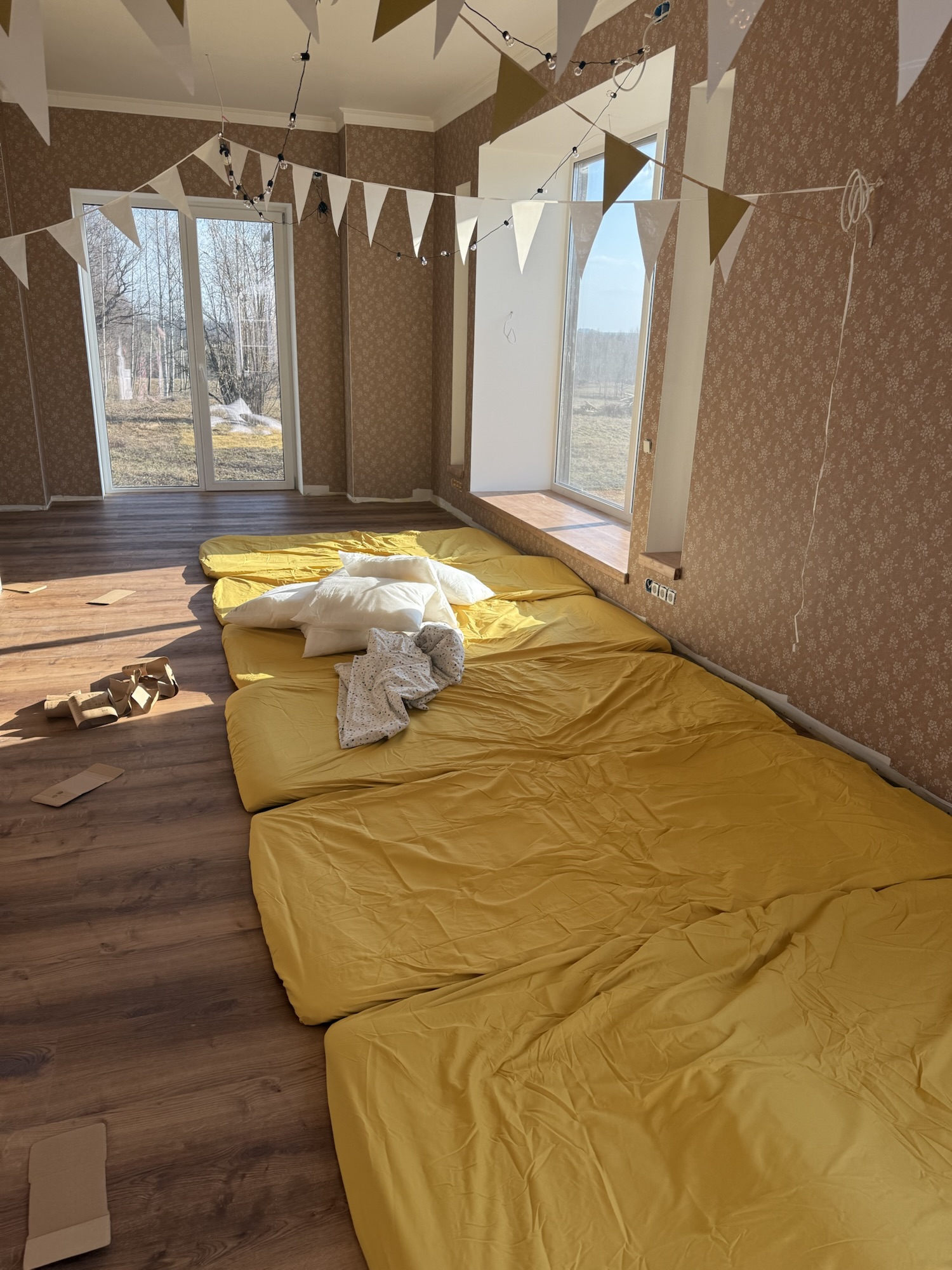 First, I laid out six flat sheets. Then came the pillows, followed by six duvets with covers. Let me tell you, getting duvet covers on is a workout—multiply that by six, and suddenly, I was questioning my life choices. 😅
