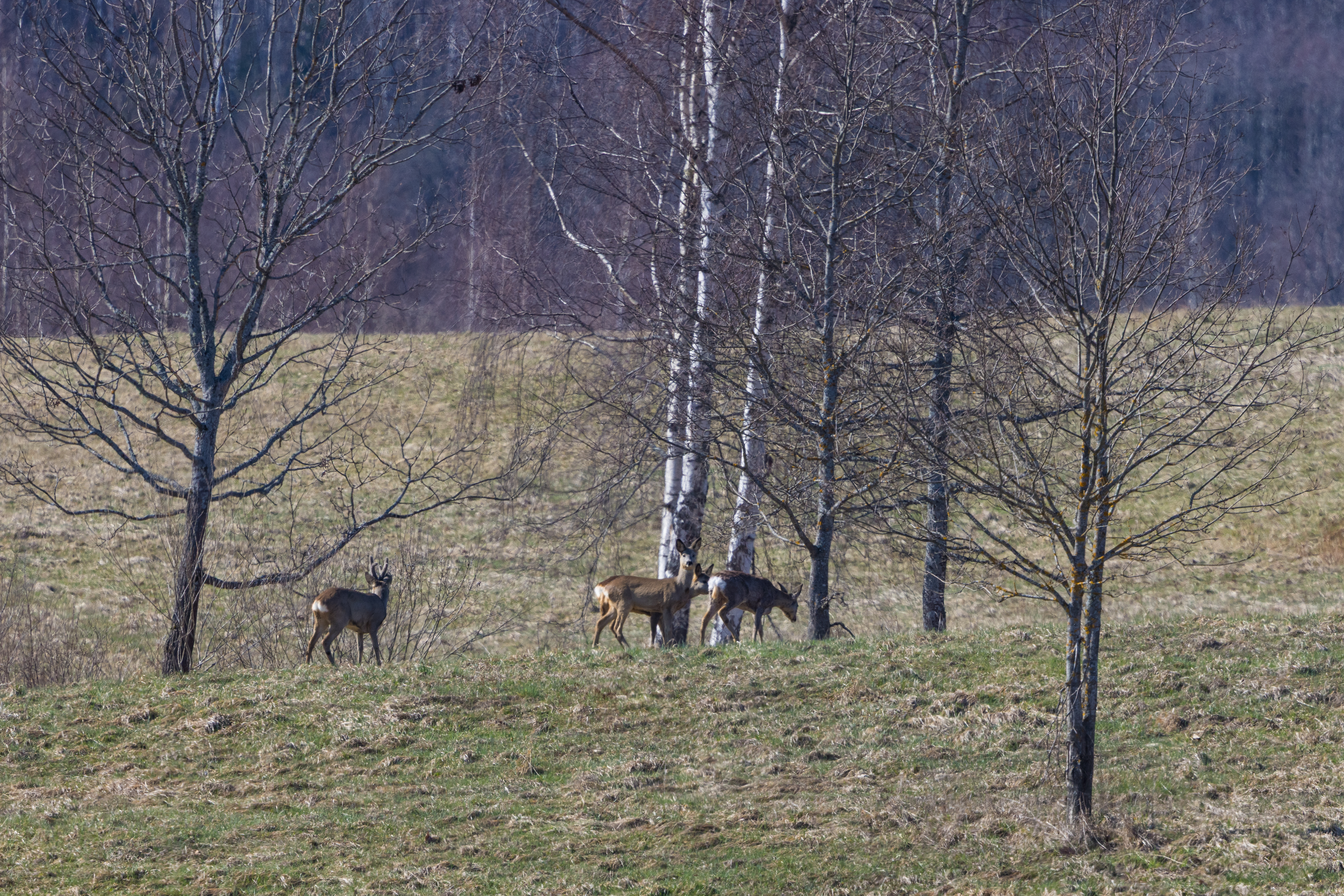 Now, with spring awakening, they have returned. As you can see in the picture, the first blades of fresh green grass are pushing through the soil, a welcome change from the dull browns of winter. And the doe family is just as delighted by it as I am. They nibbled on the tender growth, moving carefully yet confidently across the land, their ears twitching at every sound, always aware of their surroundings.