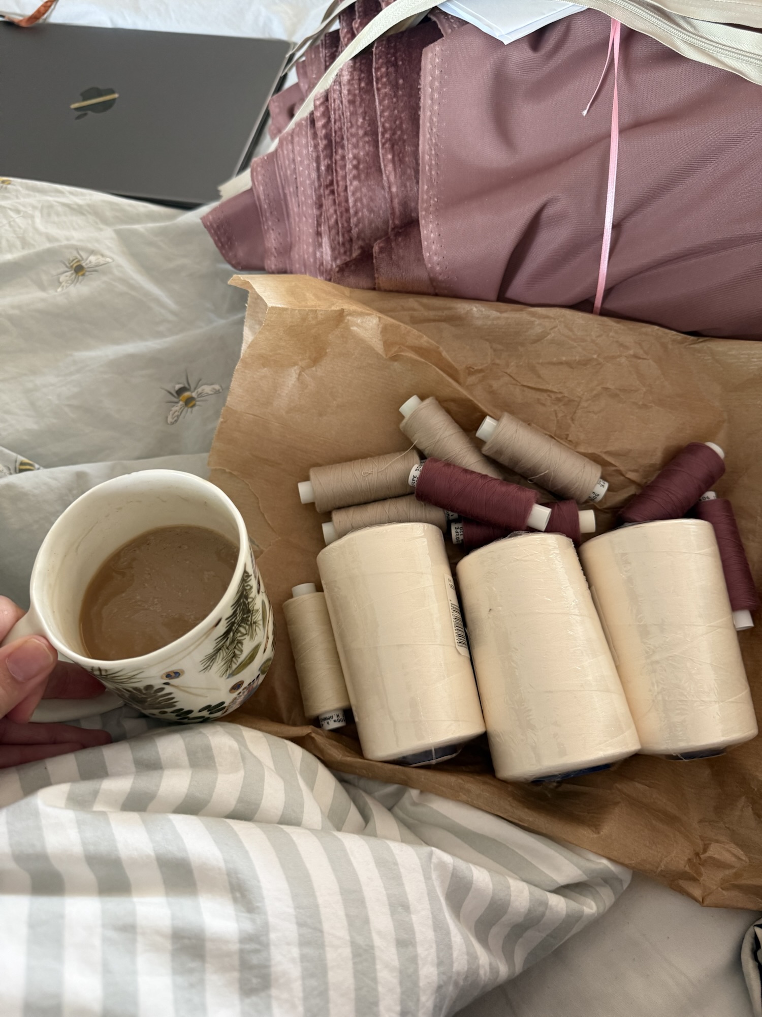 The morning started in the coziest way possible — after breakfast I took my coffe in bed. Jānis drove to the Gulbene to by some stuff for renovation and I was sipping my “morning” coffee (around 2PM😅). Jānis took out the package from Omniva, and my fabrics, threads, and zippers from a lovely little fabric shop in Cēsis had arrived!