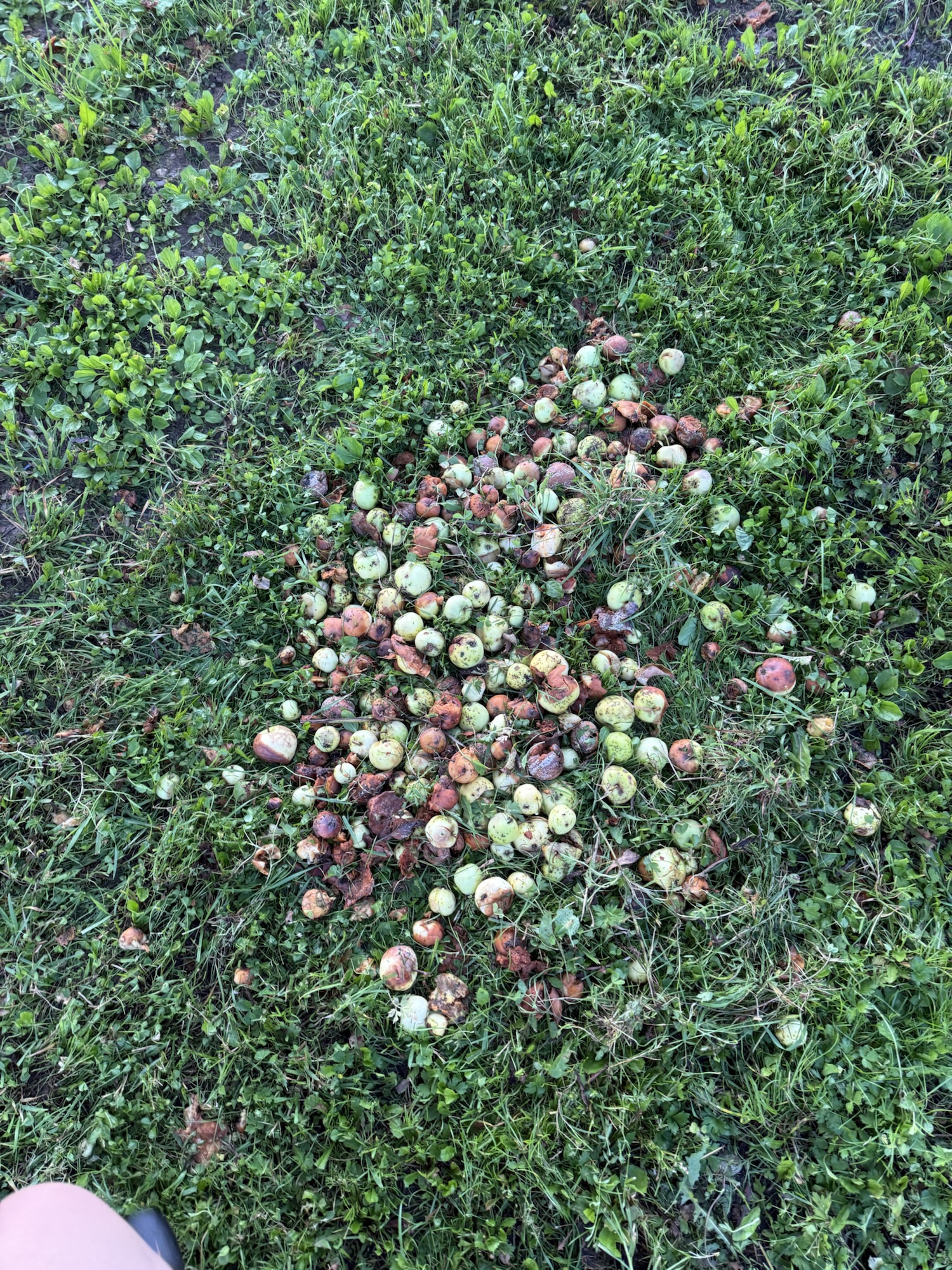 Later, I cooked dinner because Jānis’ cousin came over for a visit. We had a nice little chat at the table before I headed outside to deal with the pile of rotten apples under our old apple tree. It’s been throwing apples down for about two weeks now, and I’m pretty sure it’s because of that fungus it’s been battling. The poor thing is around 60–70 years old — too old to cry over, but it’s the only shade we have close to the house.
