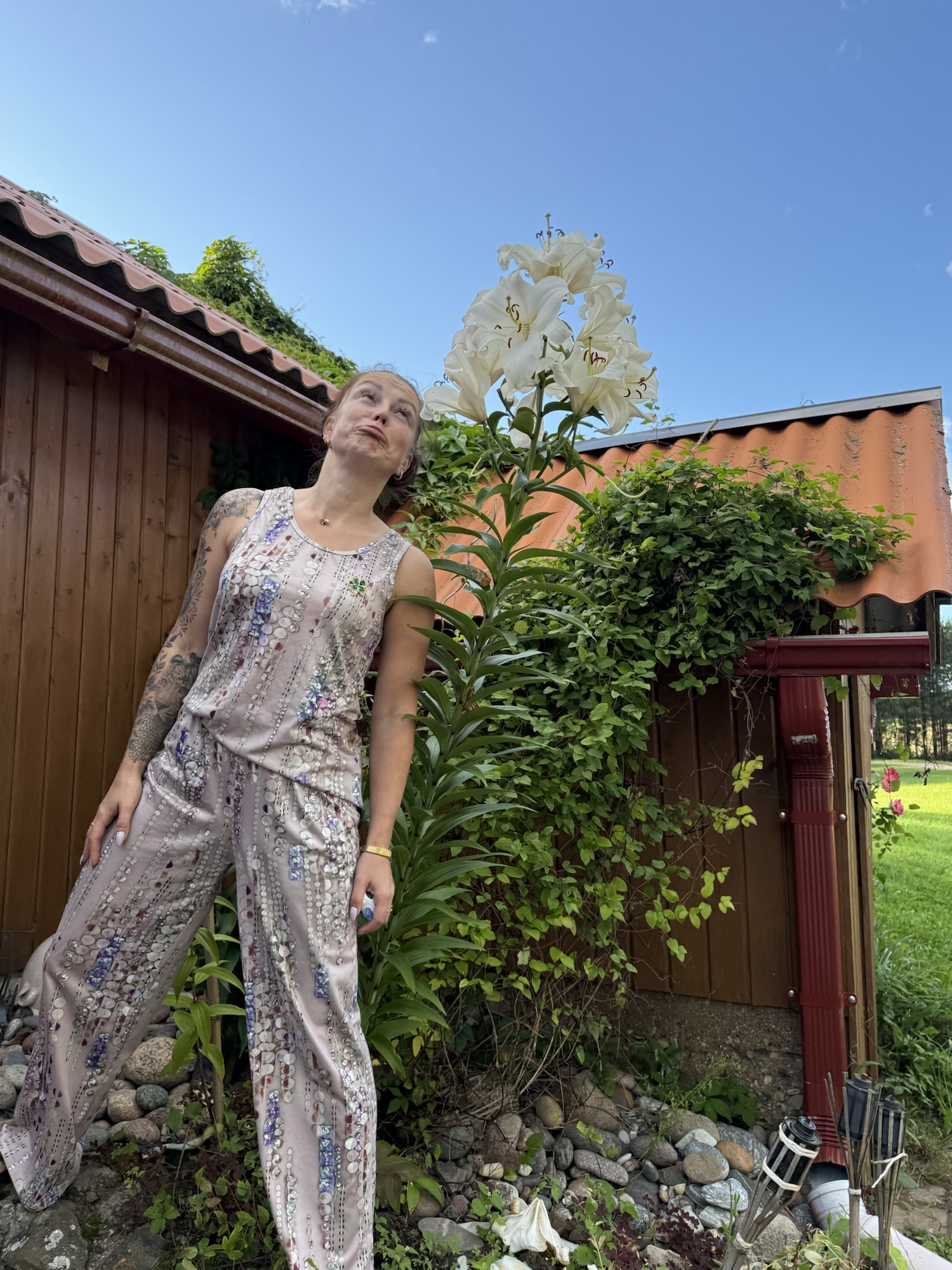 And I have to mention this huge lily! Honestly, I’ve never seen one like it. I asked Ilona — who loves lilies and would be thrilled to have such a beauty in her garden (her face said it all!) — to climb up there for a reference photo. 🙂