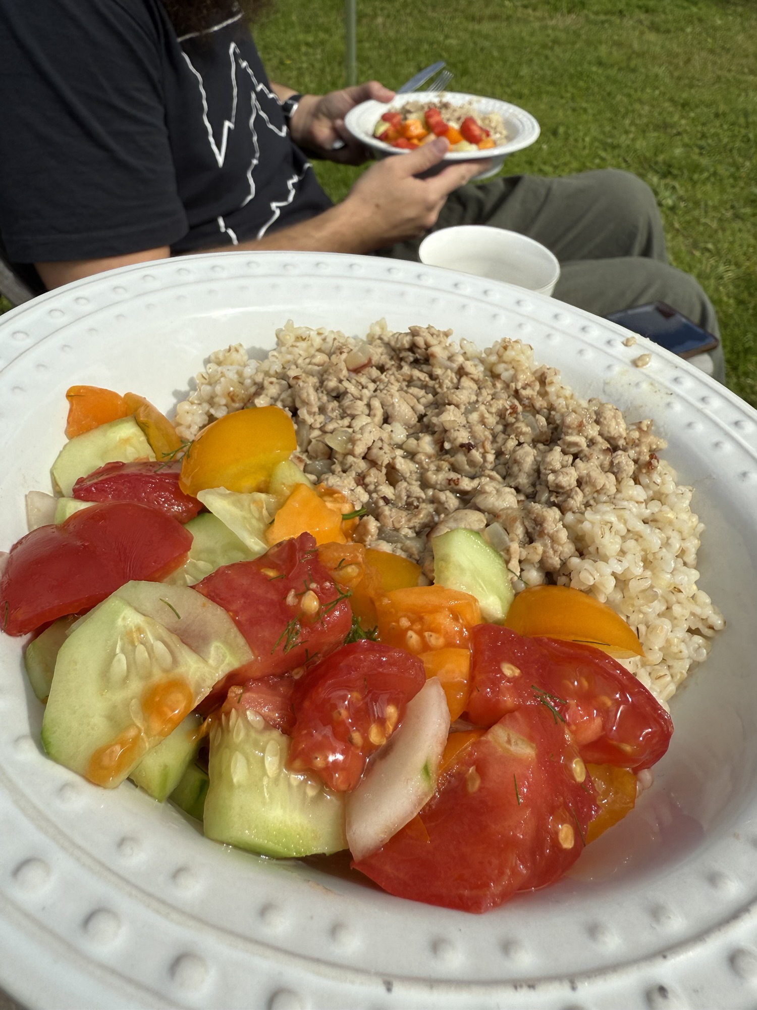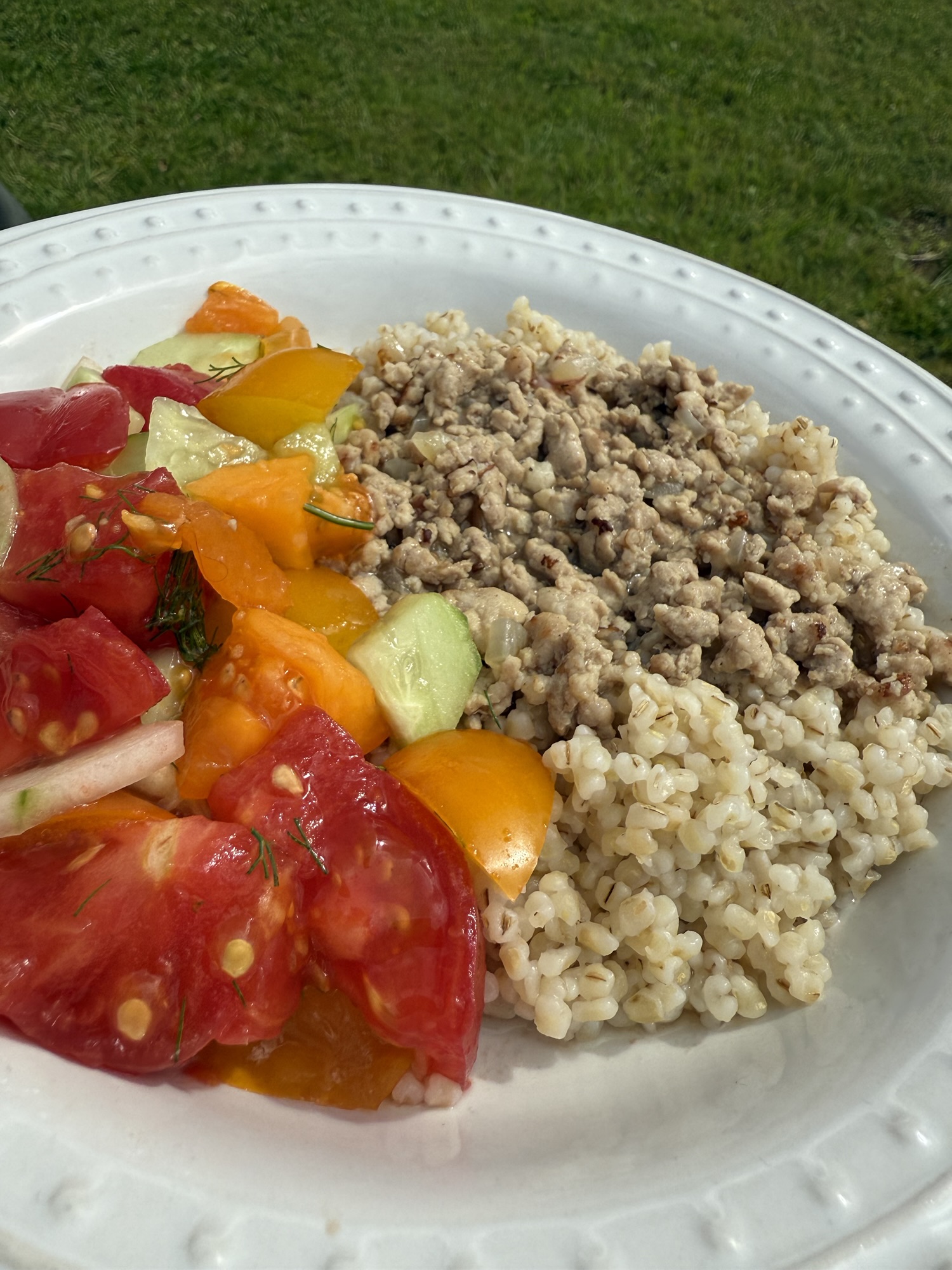 Later, I had another lovely meal outside in the garden. Wrapped snugly in a blanket, I refused to say goodbye to summer, lingering a little longer in the soft evening light. I enjoyed a simple but comforting cucumber and tomato salad with pearl barley and minced pork sauce. It felt like the perfect way to honor the last warm days, eating slowly and savoring each bite while listening to the faint rustle of leaves in the breeze.