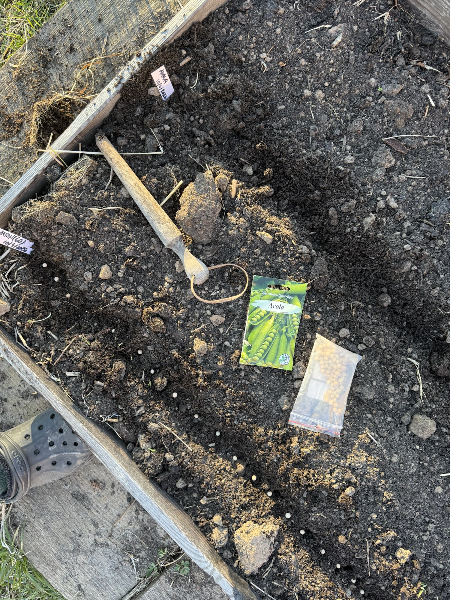 Peas like an early start. If we wait too long, the pests arrive faster than we do. So we take our chances, tuck the seeds into the soil, and trust that they’ll figure it out.