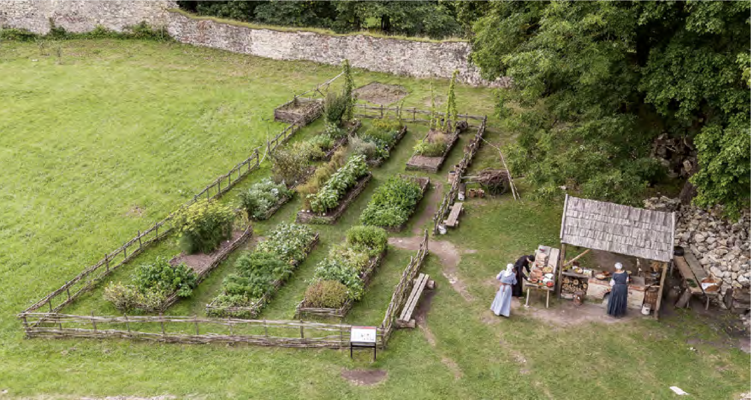 Līga Eglīte’s kitchen garden at the Cēsis Medieval Castle is a carefully reconstructed 16th-century garden based on historical research, not modern design trends. It consists of long, raised beds framed with woven hazel branches, arranged simply for function and sunlight rather than appearance.The soil is built entirely from natural, locally available materials like manure, ash, compost, and plant waste, creating a self-sustaining system.